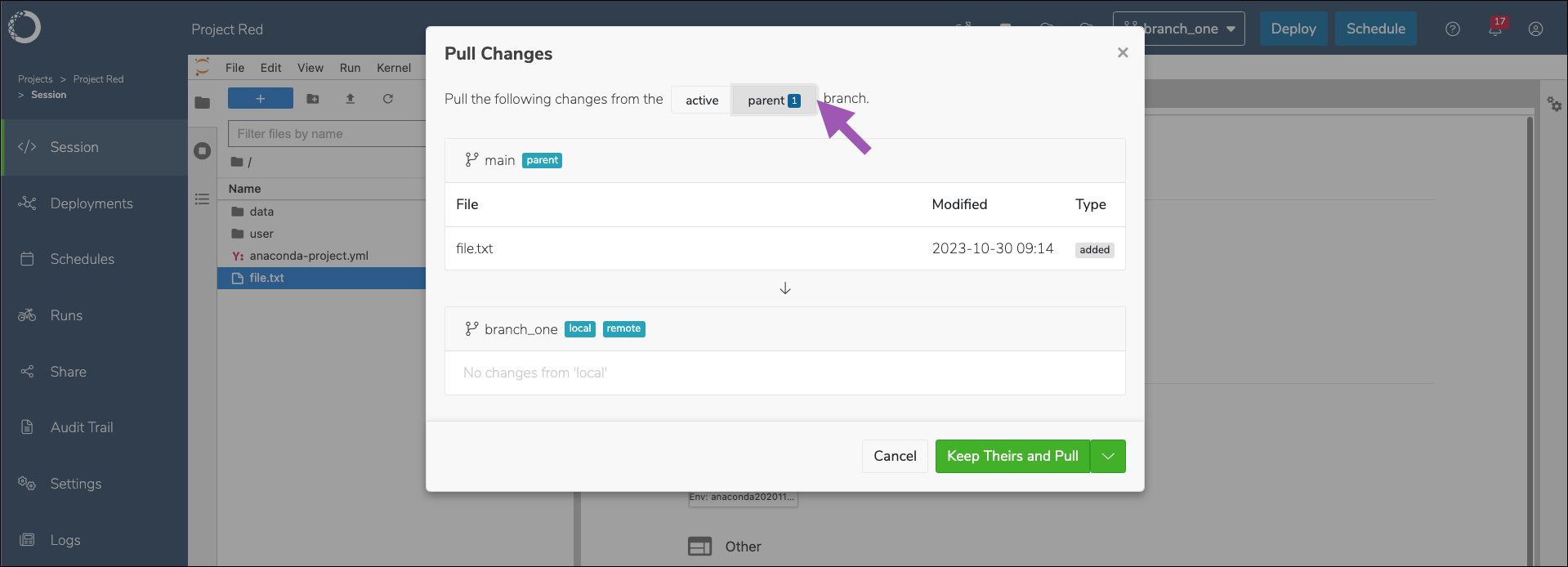 Each project in Anaconda Enterprise has its own repository that the files for the project are stored in. You can create branches off of your project to develop changes locally, then commit and push them to a remote collaborative project repository, where other users will then be able to pull your changes.