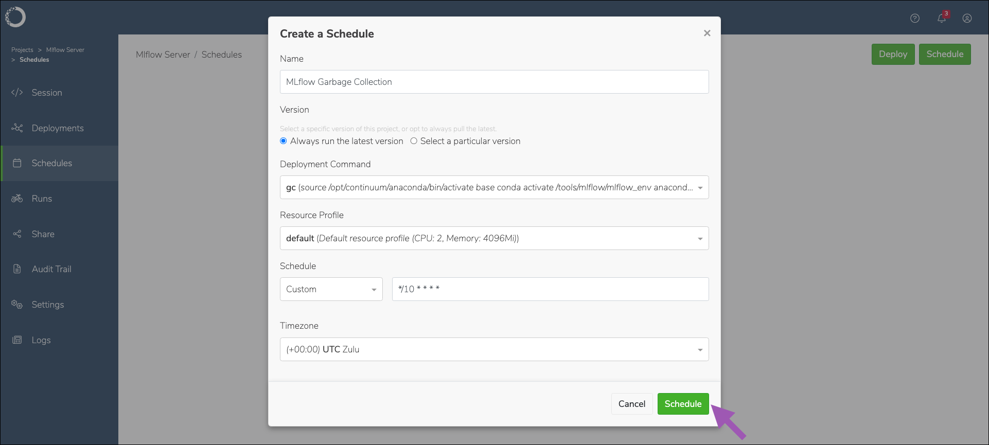 The garbage collection process works in tandem with the MLFLOW_TRACKING_GC_TTL variable that is set in the anaconda-platform.yml project file. When a resource reaches the age specified by the MLFLOW_TRACKING_GC_TTL variable AND the garbage collection process runs, it will be purged.