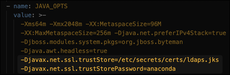 keycloak: truststore: /etc/secrets/certs/ldaps.jks truststore_password: anaconda truststore_secret: ldaps_secretUpdate your Helm Chart by running the following command:
