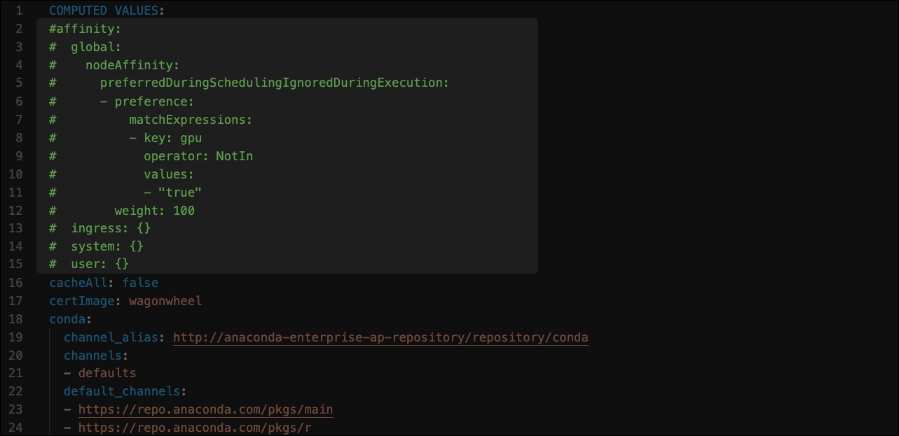 By default, CPU sessions and deployments are allowed to run on GPU nodes. To reserve your GPU nodes for sessions and deployments that require them, comment out the affinity: configuration in the file as shown: