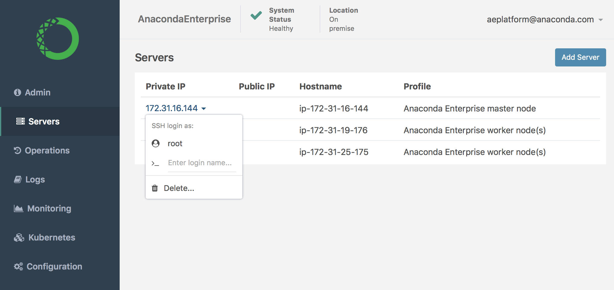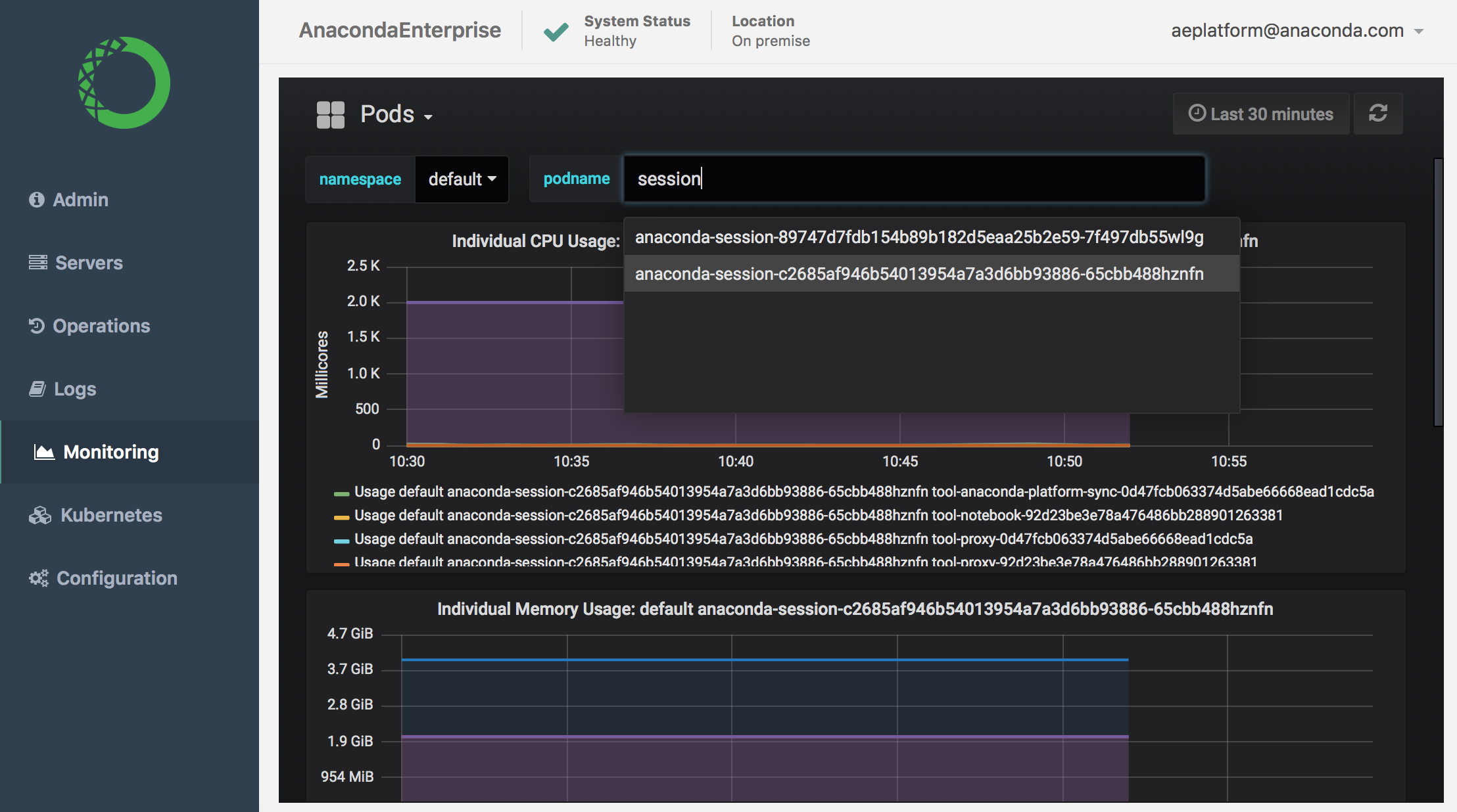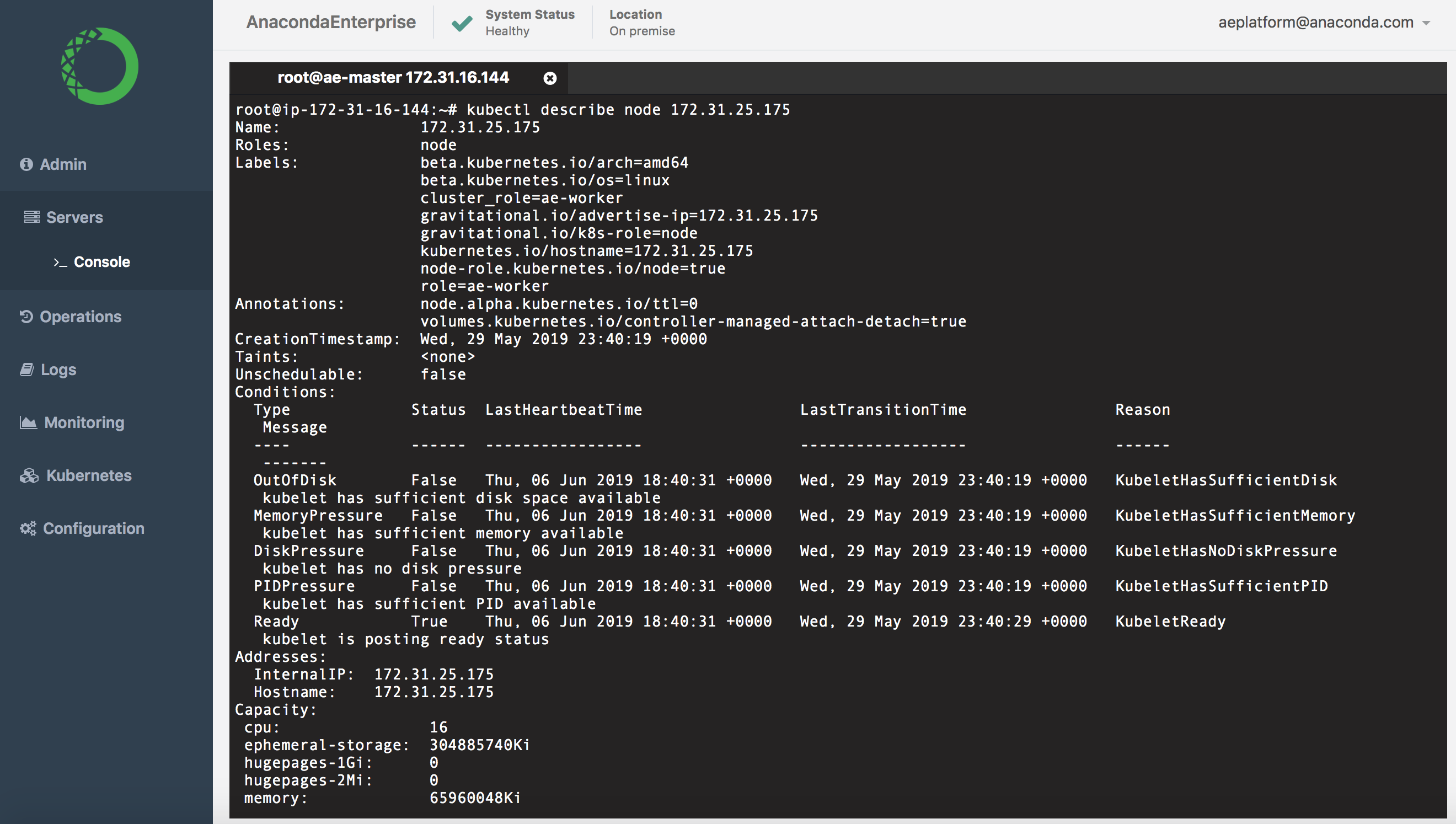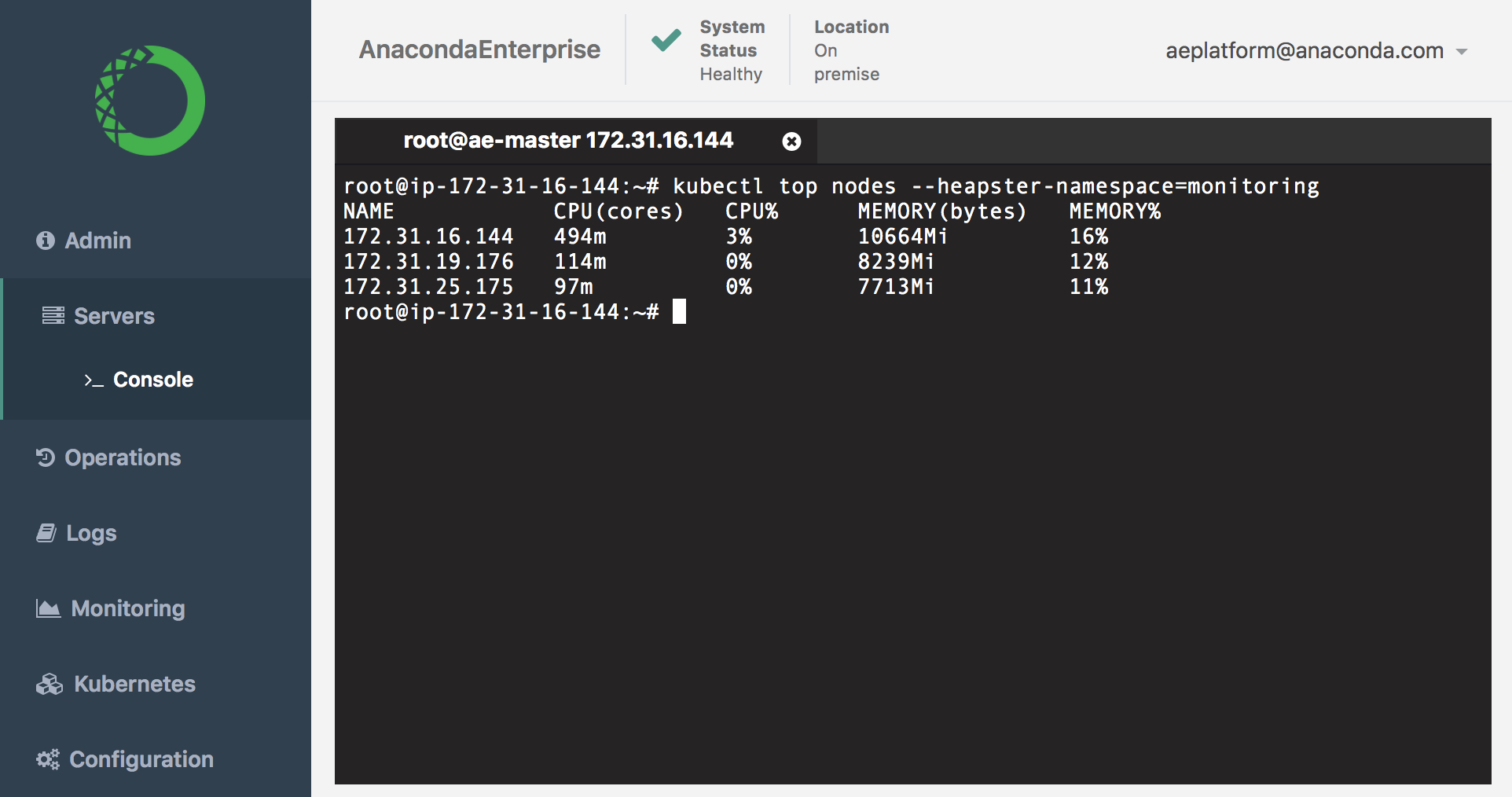 Anaconda’s Data Science & AI Workbench provides detailed logs and monitoring information related to the Kubernetes services and containers it uses. Gravity-based installations can use the provided Operations Center and Kubernetes CLI to access this information, to help diagnose and debug errors that you or other users may encounter while using the platform.